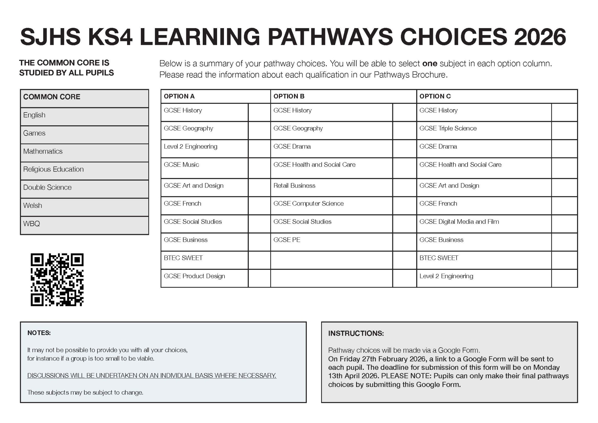 The form can only be submitted once, so please encourage your child to make absolutely sure of their choices before submitting the form. In order to access the Google form for your child to make their pathway choices, follow this link: